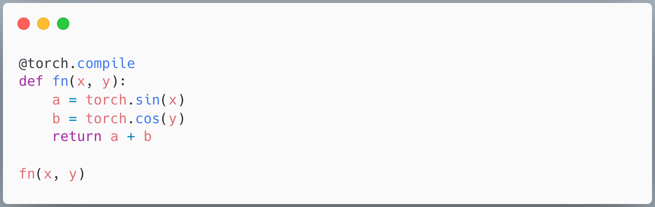 torch.compile lets you optimize PyTorch code with minimal effort: using torch.compile is as simple as applying a decorator to a function or torch.nn.Module. torch.compile automatically captures tensor operations into a computation graph that it then generates optimized code for.