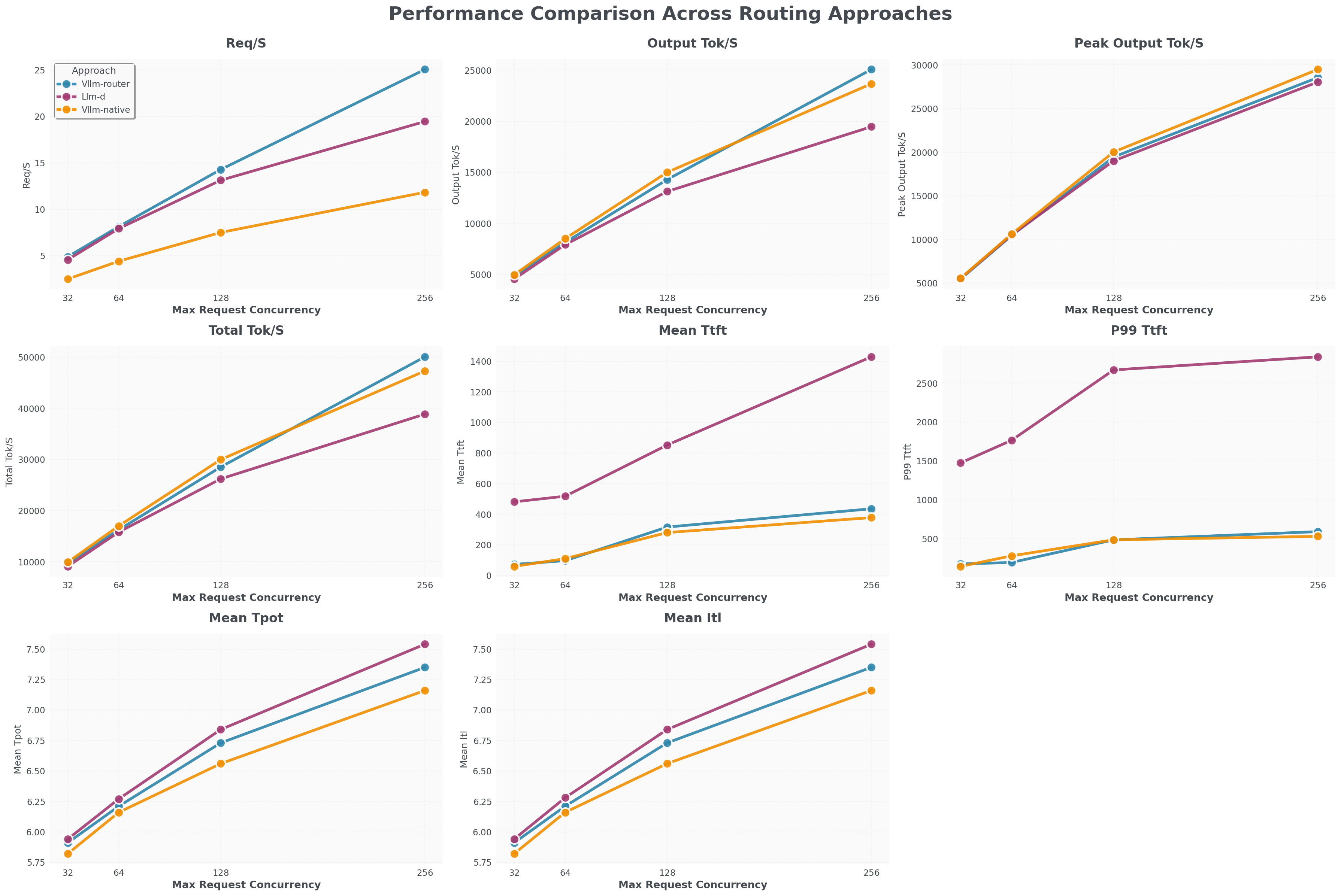 • vLLM Router (blue line) Req/S throughput is 25% higher than llm-d (purple line) and 100% higher than K8s-native load balancer (orange line).