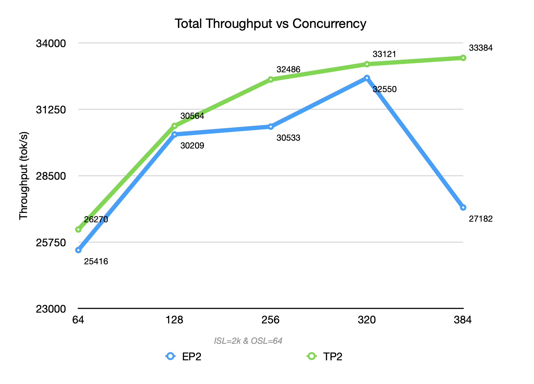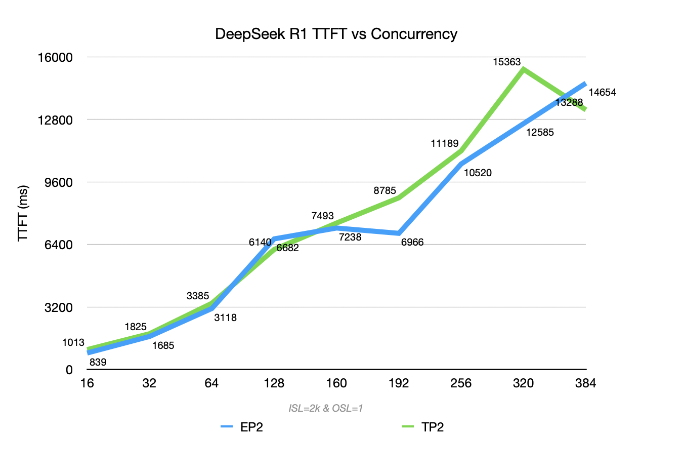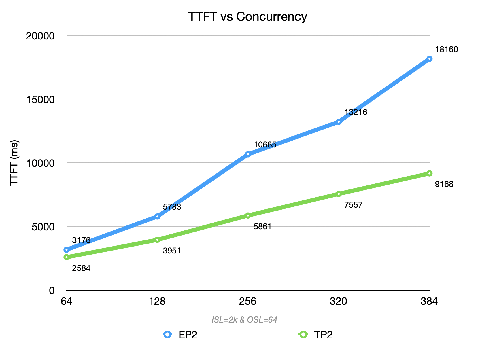 EP2 (blue curve) reaches a throughput ceiling of 22476 TGS, outperforming TP2 (green curve) in both throughput and the growth slope of TTFT. This benefits from EP’s typical “large packet, low frequency” communication pattern, which better utilizes the high bandwidth of RDMA/NVLink under high concurrency.