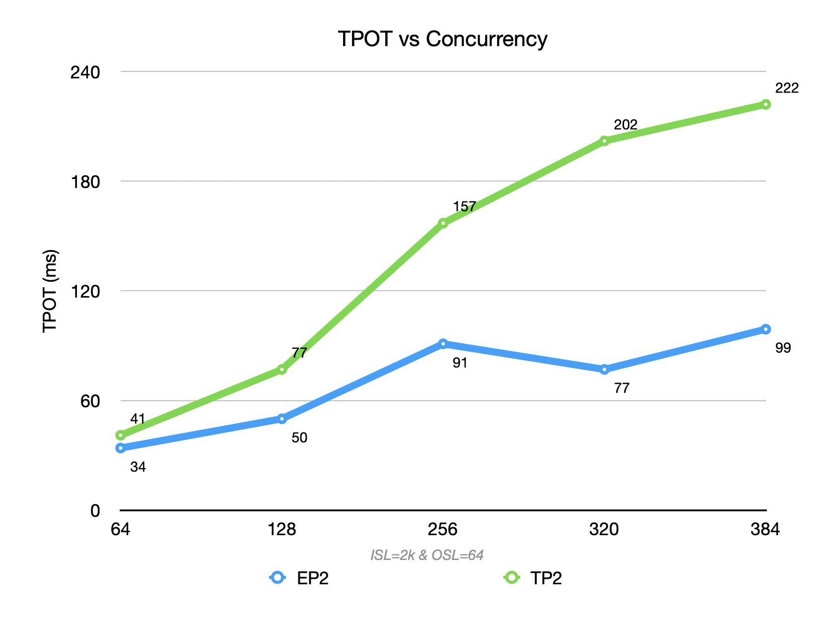• In contrast, for output-heavy case, the TPOT advantage of EP2 becomes dominant, and it is therefore the preferred configuration.