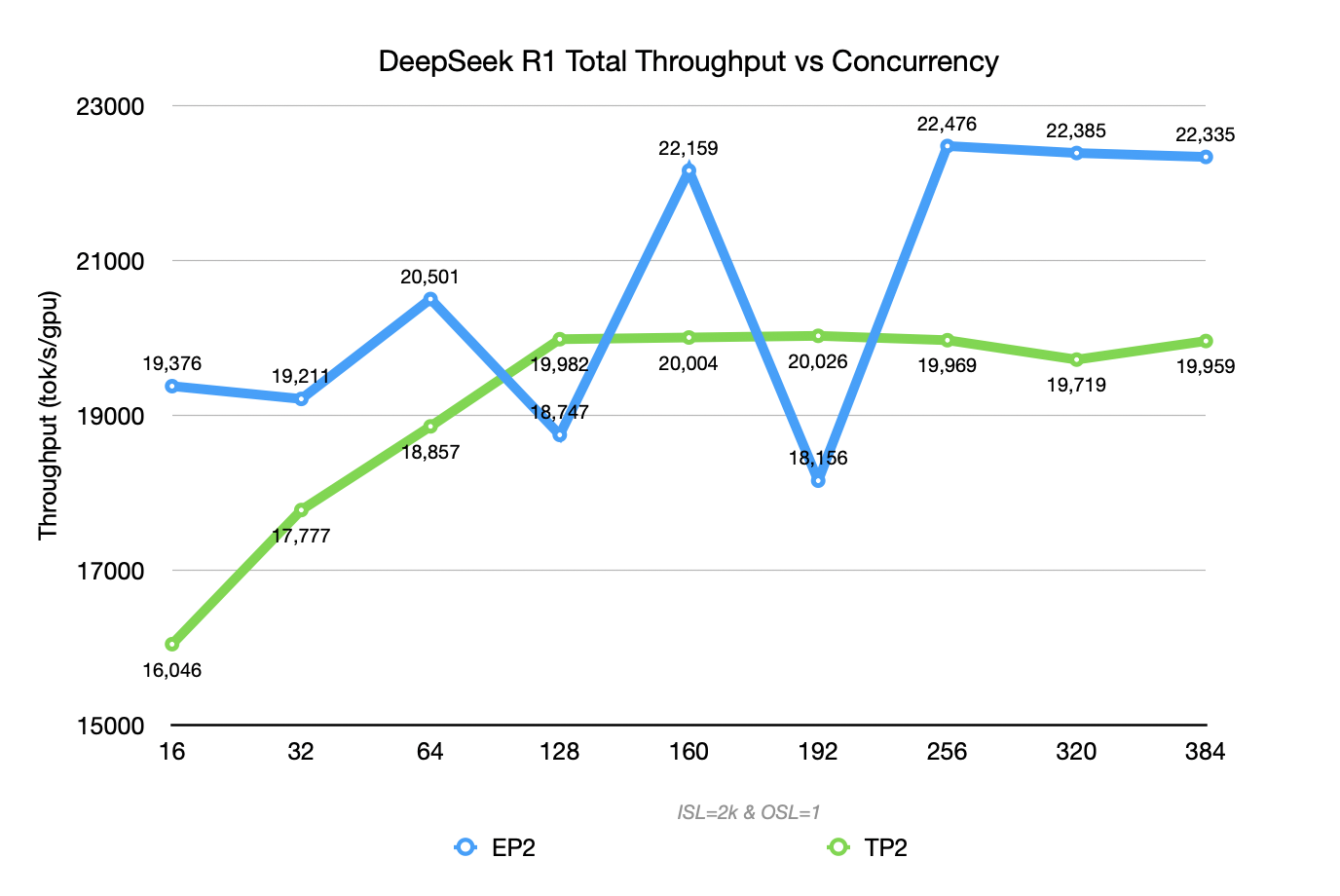 • DeepSeek R1 in EP2 can reach a peak Prefill throughput of ~ 22476 TGS.