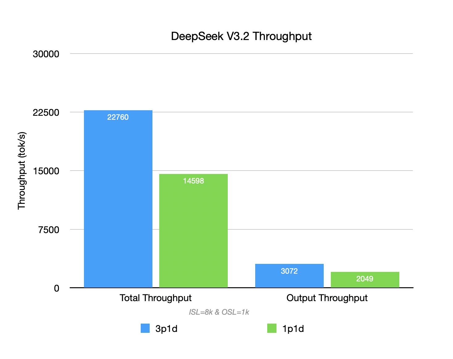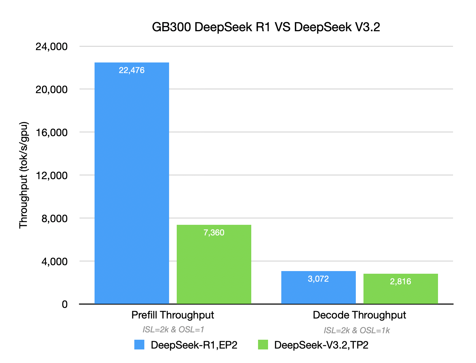As shown in the chart below, with the same GB300 setup, DeepSeek R1’s Prefill throughput capability is ~ 3x that of DeepSeek V3.2.
