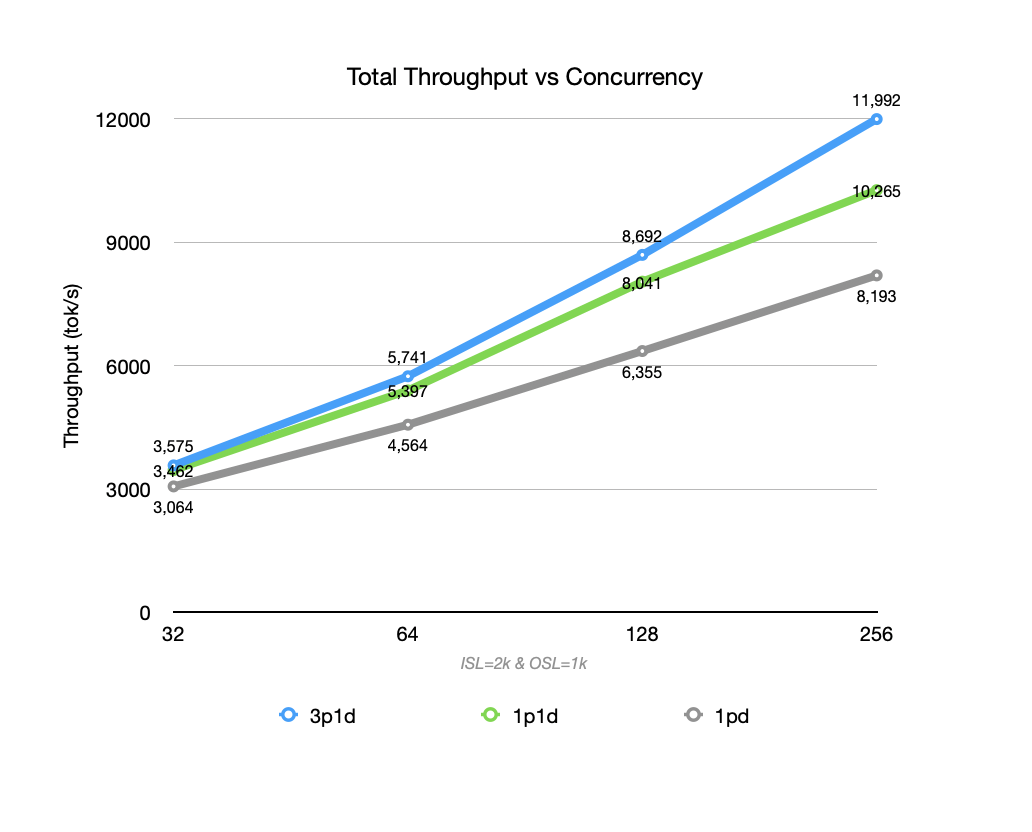 When ISL continues to grow (from 2K to 8K), the throughput of the 1P1D setup begins to struggle, with Prefill becoming the bottleneck. Requests wait in queue at the P node, unable to fully utilize the Decoder’s compute power. When adding 2 P replicas (3P1D), they parallelize the Prefill phase of more requests, achieving better total throughput.